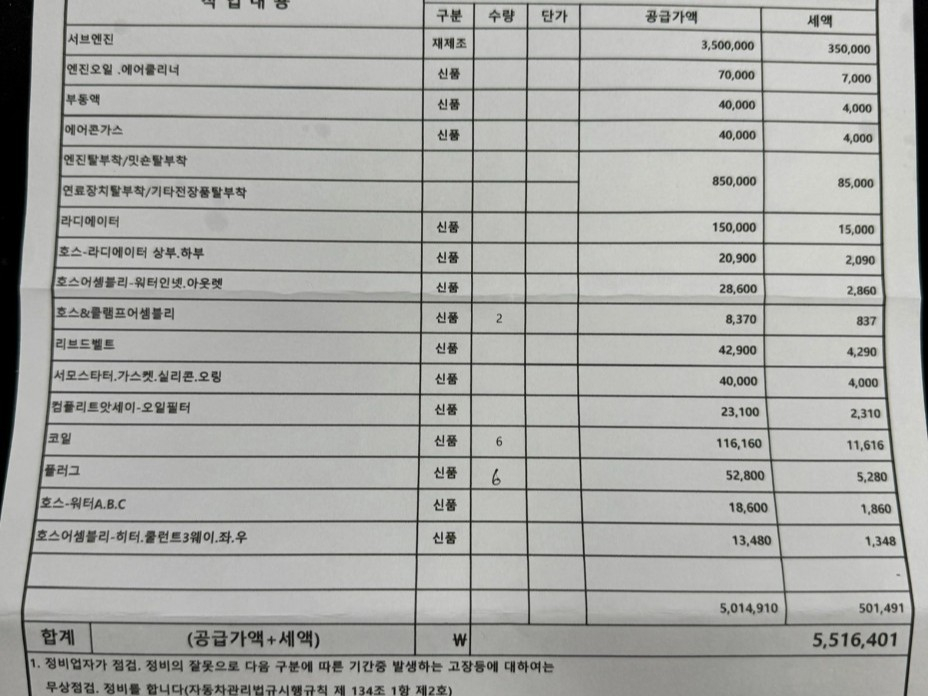 - 엔진 25년12월 재생엔진 500만원치 수리